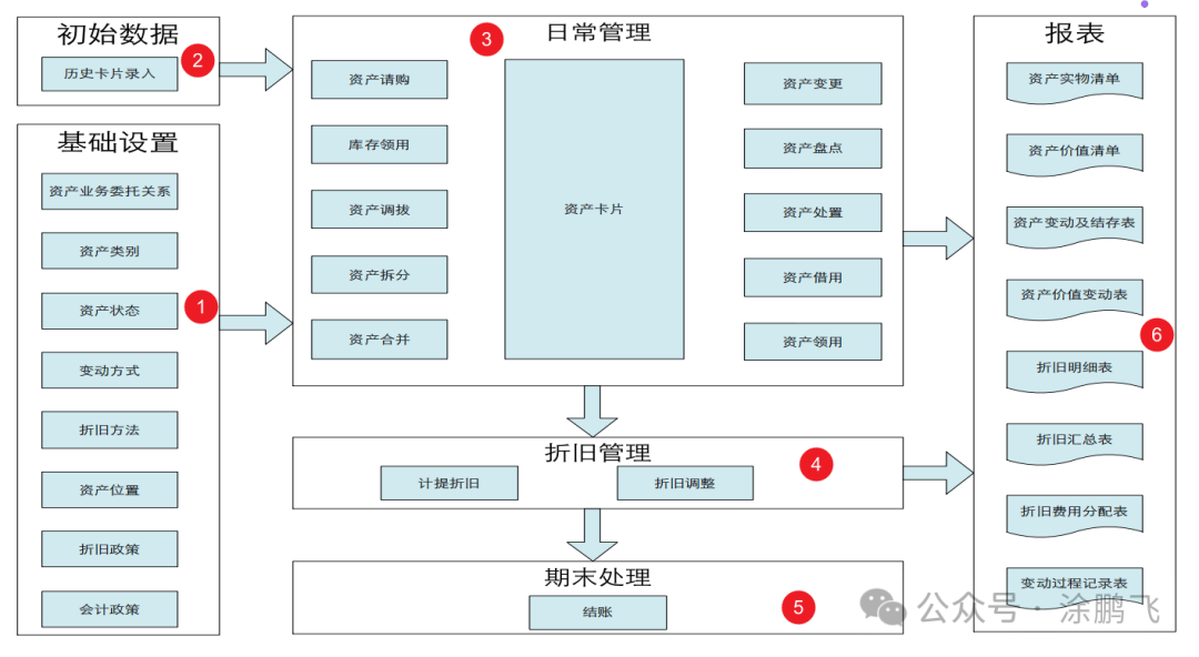 然后第四部分,是对固定资产折旧这个大的业务内容进行管理,分为计提折旧和折旧调整。最后就是财务概念上的期末结账,还有供管理层和业务人员使用的资产相关报表。