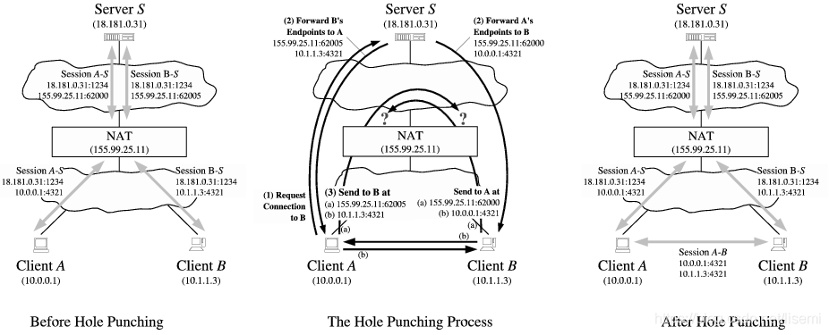 - Client有可能分到多个公网地址,例如:在NAT将公网地址155.99.25.11:62000分配给client A与S的会话之后,NAT可能会将另一个公网地址(如155.99.25.11:62001)分配给A试图发起与B的P2P会话。在这种情况下,依据提供的连接打洞过程将失败,因为后续来自B的传入消息到达NAT A的错误端口号。