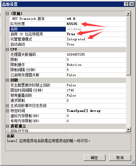 [2] 启动32位应用程序:默认值False,改为True, 否则安装一些32的组建或32位的php都会出错。