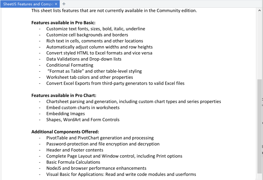 在官网http://sheetjs.com/里我们可以看到,这里简单的介绍了下社区版和pro版。重要的一点是,Pro版的收费价格并没有给出,只说了需要pro版的话请邮件联系他们。