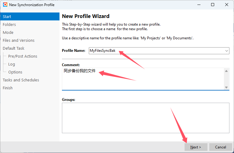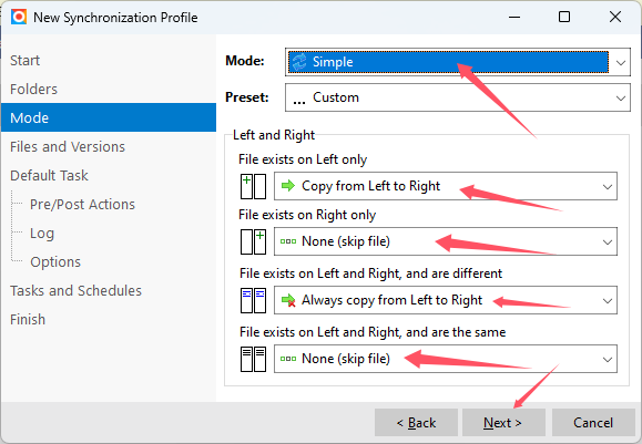 6、确认无误后,点击“Next” 上面是设置同步备份方法,建议按照以上设置即可。 Mode选择“Simple”简单备份方式; Left and Right(备份来源和目的地): File exists on Left only,选择“Copy from Left to Right”,意思是如果文件只在左边存在时,则从左边复制到右边; File exists on Right only,选择“None(skip file)”,意思是如果文件只在右边存在时,则跳过,什么也不做; File exists on Left and Right, and are different,选择“Always copy from Left to Right”,意思是如果文件在两边都存在并且不同时,则永远只从左边复制到右边; File exists on Left and Right, and are the same,选择“None(skip file)”,意思是如果文件在两边都存在并且相同时,则跳过,什么也不做; 7、然后点击“Next”