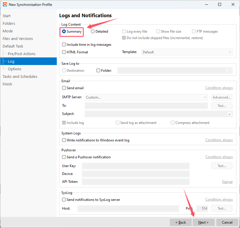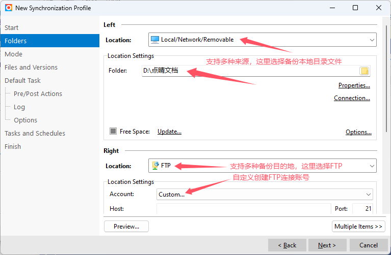 8、这个不用改,点击“Next” 9、点击“Next” 10、不用添加动作,点击“Next” 11、Log,选中“Summary”(概况即可,不需要记录详细内容),然后点击“Next” 12、什么都不用改,直接点击“Next” 13、Task and Schedules(任务和计划),点击“New...” 14、点击“Next” 同步备份时间,支持按天、周、月进行设置。 这个备份时间设置很重要,一定要确保这个时间点电脑不会关机,否则同步备份动作永远也不会执行,一般建议设置为每天中午12:30左右开始比较合适。 这里是支持设置无限多个备份触发器的,可以设置多几个同步时间,例如早上8:30、下午5:15等,可以确保尽可能将本电脑上的文件实时同步到FTP服务器上。 15、确认无误后,点击“Next” 16、点击“Finish”,就完成了同步备份设置工作,在任务列表中,就可以看到这个同步任务了: 相关教程: