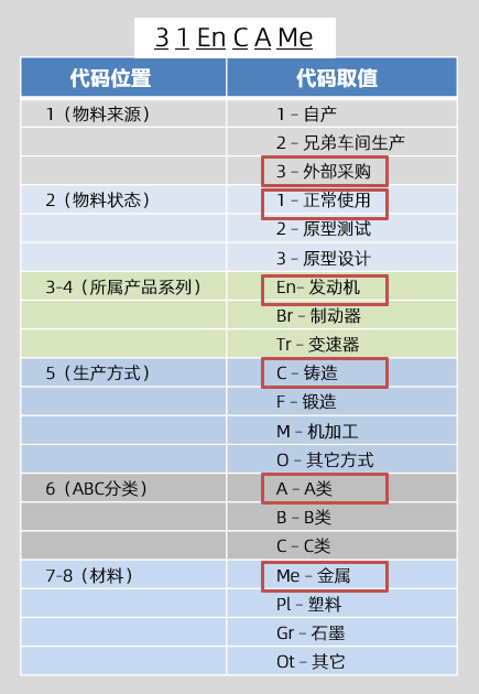 请看上图,这里有一个物料编码31EnCAMe,结合图中的物料编码规则,我们可以了解这是一个什么物料。这是一个从外部采购回来的物料,这个物料目前是正常使用,属于发动机系列的配件,是一个铸造件,属于A类物料,它的材质是金属。可以看出,编码中的每一位都是有意义的。