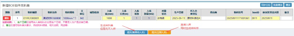 5.最后就是提交了。可以根据情况选择“提交待入库”或者“提交直接入库”。 备注:如果还没有创建物料,或者没有对应仓库的话可以根据链接选择教程: 点晴ERP-新建仓库仓位基础资料 点晴模切ERP更多信息:http://moqie.clicksun.cn,联系电话:4001861886 该文章在 2025/9/16 9:52:14 编辑过 |