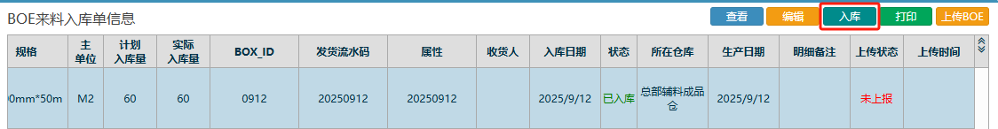 7.查询到对应订单之后,按图操作:先进行入库,上传BOE