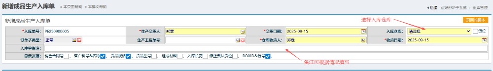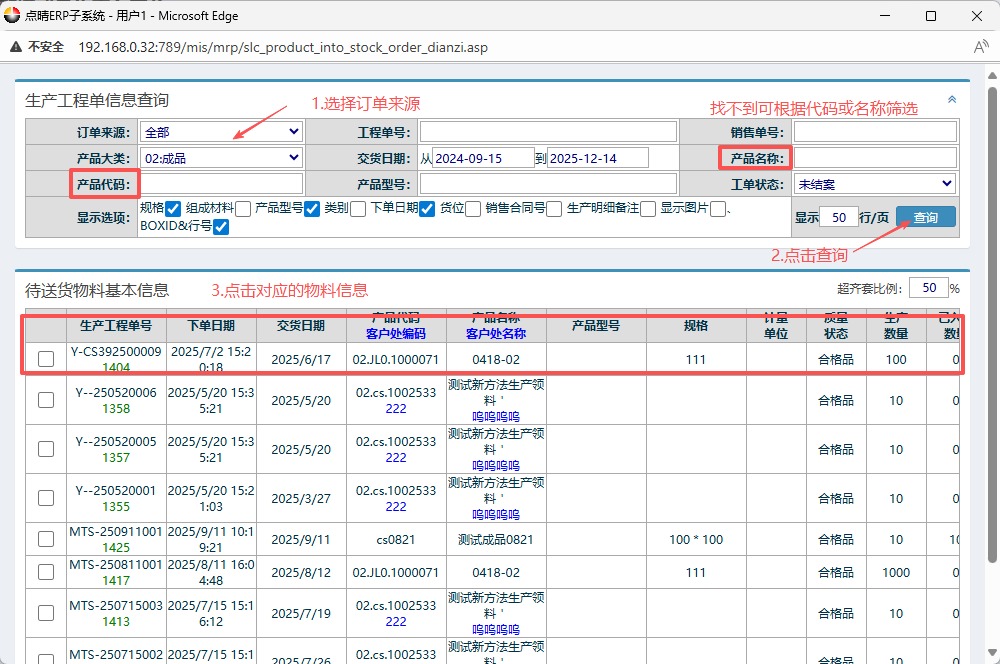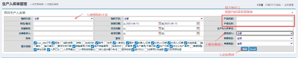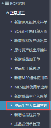 ![]() ![]() 1.进入ERP系统之后,点击“BOE定制”,点开“正常加工”,然后找到“新增成品生产入库单”。 2.进入界面后,按图操作:选择好对应入库仓库。备注可根据情况填写。 3.接着点击下方的“货品编码”,会弹出物料的信息界面。 弹出界面后,按图操作:选择订单来源,然后点击查询,点击对应的物料信息。 如果找不到可根据代码或名称筛选。 4.选好物料后,按图操作:填写入库数量、日期以及入库仓库(与上面一致)。 根据情况选择“待审核”或者“立即入库”。如果有超入的情况下,需要设置好超入的比例。 超入:指超出入库订单指定的数量。 5.提交之后,回到左侧功能菜单,点击“成品入库单管理”。 6.点击进入后,按图操作:选择订单大类,是否是超入的订单,然后点击查询(找不到可以根据代码或名称筛选)。