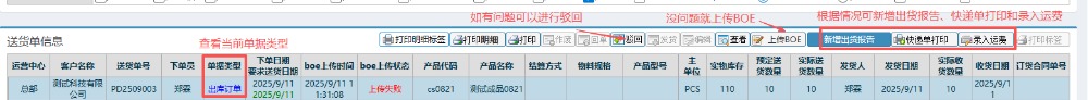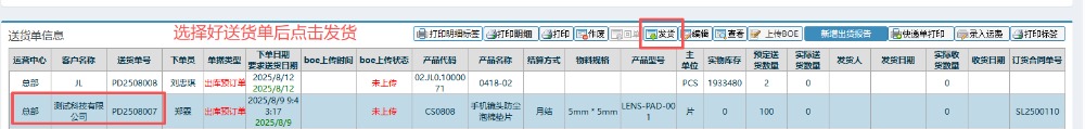 进入发货界面,按图操作:选好发货仓库以及承运商,备注根据情况补充。然后填好实际发货数量,发货货位要跟上面仓库一致,最后确认发货并回单。 注:送货单出货方式可根据情况进行选择 8.发货和回单之后,确认当前单据类型为出库订单,然后点击上传BOE。
