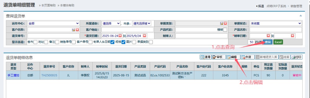 ![]() ![]() 1.进入ERP系统后,在左侧功能菜单里找到“销售管理”,点开“销售退货单管理”,“退货单明细管理” 2.进入界面后,按图操作:先点击查询,然后找到对应退货单点击编辑。 3.点击编辑进入页面后,按图操作:根据情况选择退货操作(退款、补货),填写退货数量、含税单价以及日期。点击编辑。 流程结束。 点晴模切ERP更多信息:http://moqie.clicksun.cn,联系电话:4001861886 该文章在 2025/9/24 9:30:30 编辑过 |