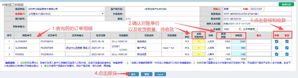 3.查询之后,在下方会得出对应的收款对账单,确认对账单价以及收货数量待收款,点击确认复核收款,最后点击提交
