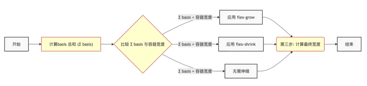 Flex空间分配逻辑Flex空间分配的三步法: 第一步计算所有子元素basis的总和 第二步比较容器宽度和总的basis宽度的 第三步计算容器宽度 总的basis小于容器宽度,应用flex-grow 总的basis大于容器宽度,应用flex-shrink 总的basis等于容器宽度,无需伸缩 整个流程图如下: 计算公式如下图: 计算实战当空间充足时,flex-grow生效,元素尺寸变大一起加大多余的空间当前项的最终宽度 = basis + (容器宽度-总的basis) * 当前项的grow/总的grow,下面来看一个示例 关键代码如下: