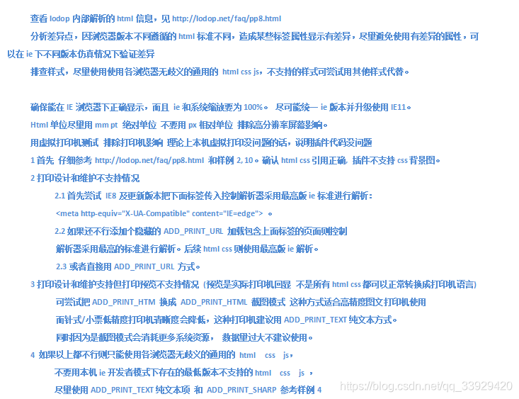 1. 对打印的html模板,写html和css的时候要注意IE的兼容性,进行IE7+全部兼容,打印膜版避免使用flex布局、